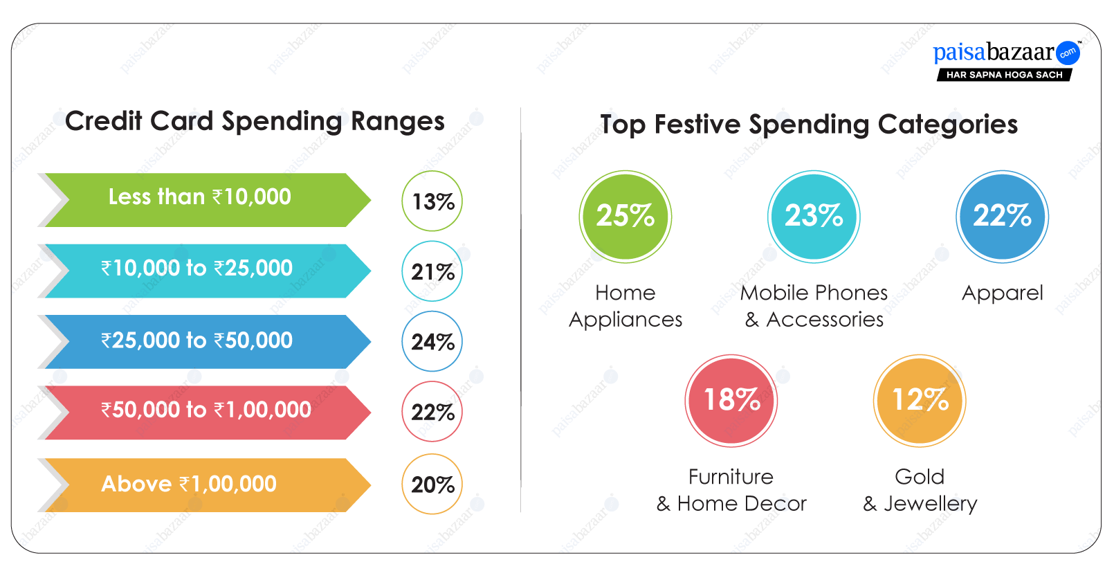 The survey with over 2300 respondents revealed that home appliances (25%), mobiles, gadgets & accessories (23%), and apparel (22%) were the top three spend categories on credit cards in the festive season, followed by furniture and décor (18%). Gold & jewellery also accounted for 12% of credit card spends during Diwali. The survey indicated increasing use of credit cards to make high-ticket purchases more rewarding.