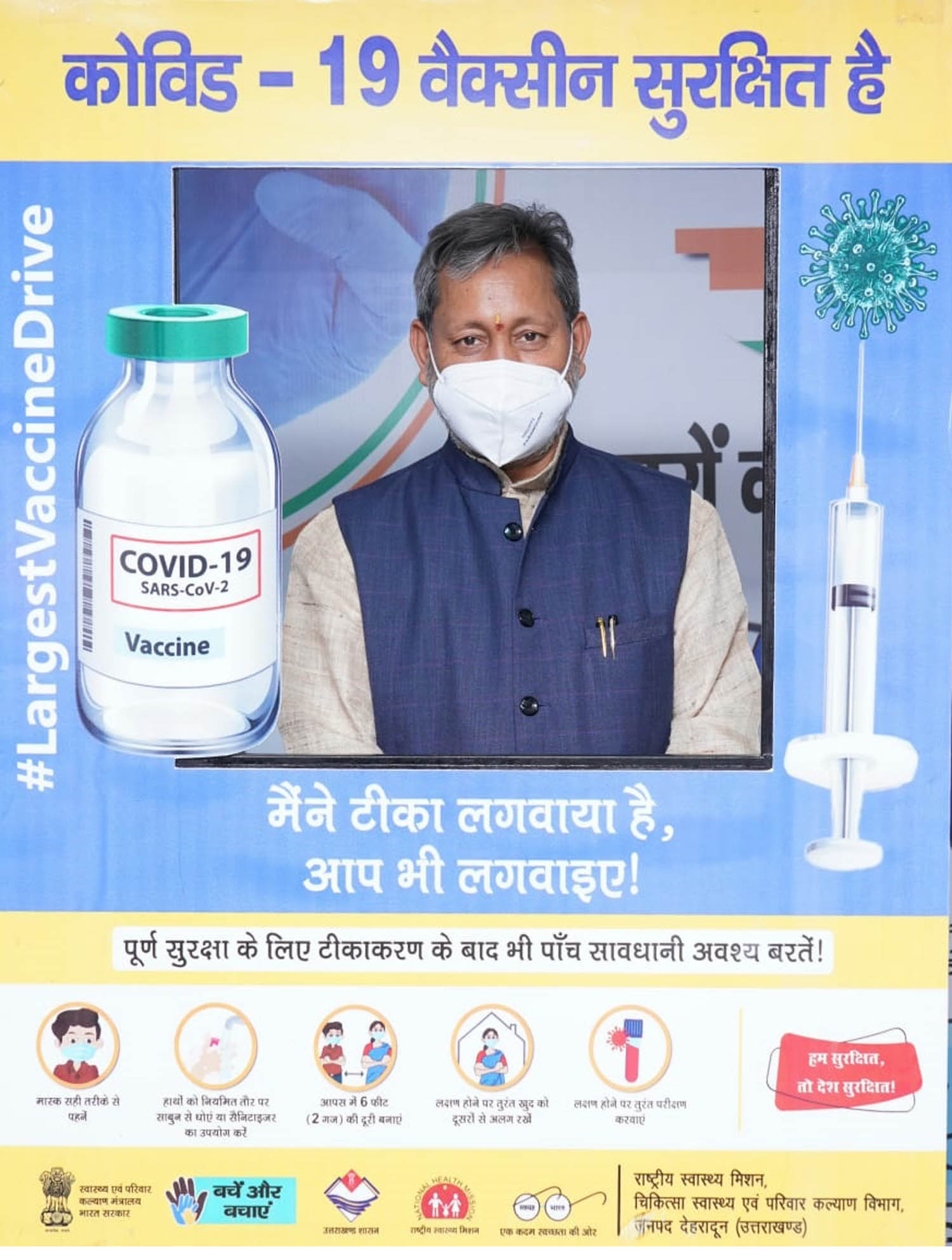 मुख्यमंत्री श्री तीरथ सिंह रावत जी व उनकी पत्नी श्रीमती रश्मि रावत ने दून मेडिकल कॉलेज अस्पताल पहुँचकर प्राचार्य डॉ आशुतोष सयाना व अपने फिजिशियन डॉ एन.एस. बिष्ट की निगरानी में कोविड वैक्सीनेशन करवाया। इस अवसर पर मुख्यमंत्री जी ने कहा कि कोरोना की रोकथाम के लिए जरूरी है कि सभी लोग वैक्सीन अवश्य लगवाएं। उन्होंने कहा कि बहुत जल्द उत्तराखंड में 18 से 45 आयु वर्ग के लोगों के लिए भी वैक्सीनेशन शुरू होने जा रहा है। सूचना एवं लोक सम्पर्क विभाग।